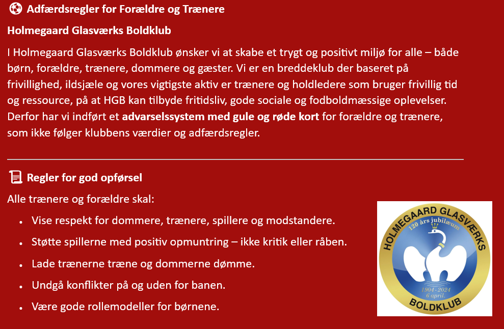 I Holmegaard Glasværks Boldklub ønsker vi at skabe et trygt og positivt miljø for alle – både børn, forældre, trænere, dommere og gæster. Vi er en breddeklub der baseret på frivillighed, ildsjæle og vores vigtigste aktiv er trænere og holdledere som bruger frivillig tid og ressource, på at HGB kan tilbyde fritidsliv, gode sociale og fodboldmæssige oplevelser.